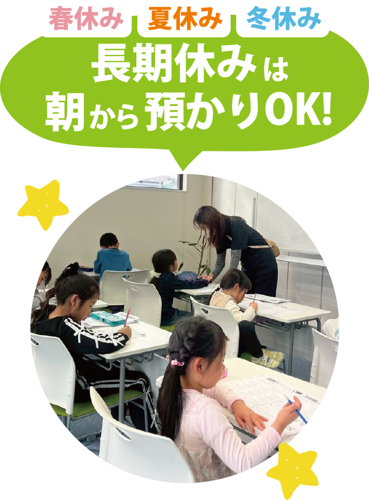 学校の宿題はもちろん、英語・そろばん・プログラミング・書道・体操など、10種類ものクラスから子どもたち一人ひとりに合ったクラスを選択し、毎日楽しく学ぶことができます。
